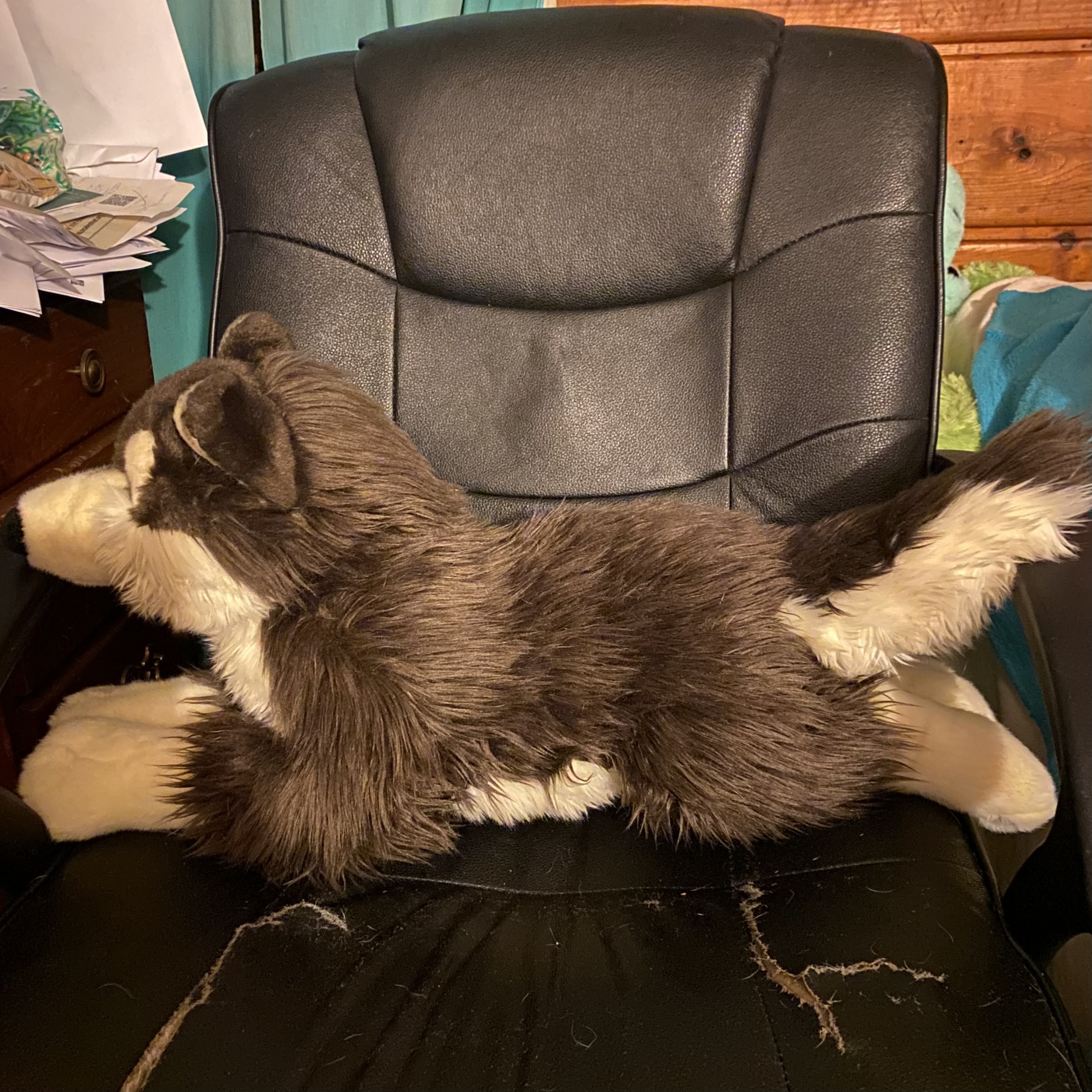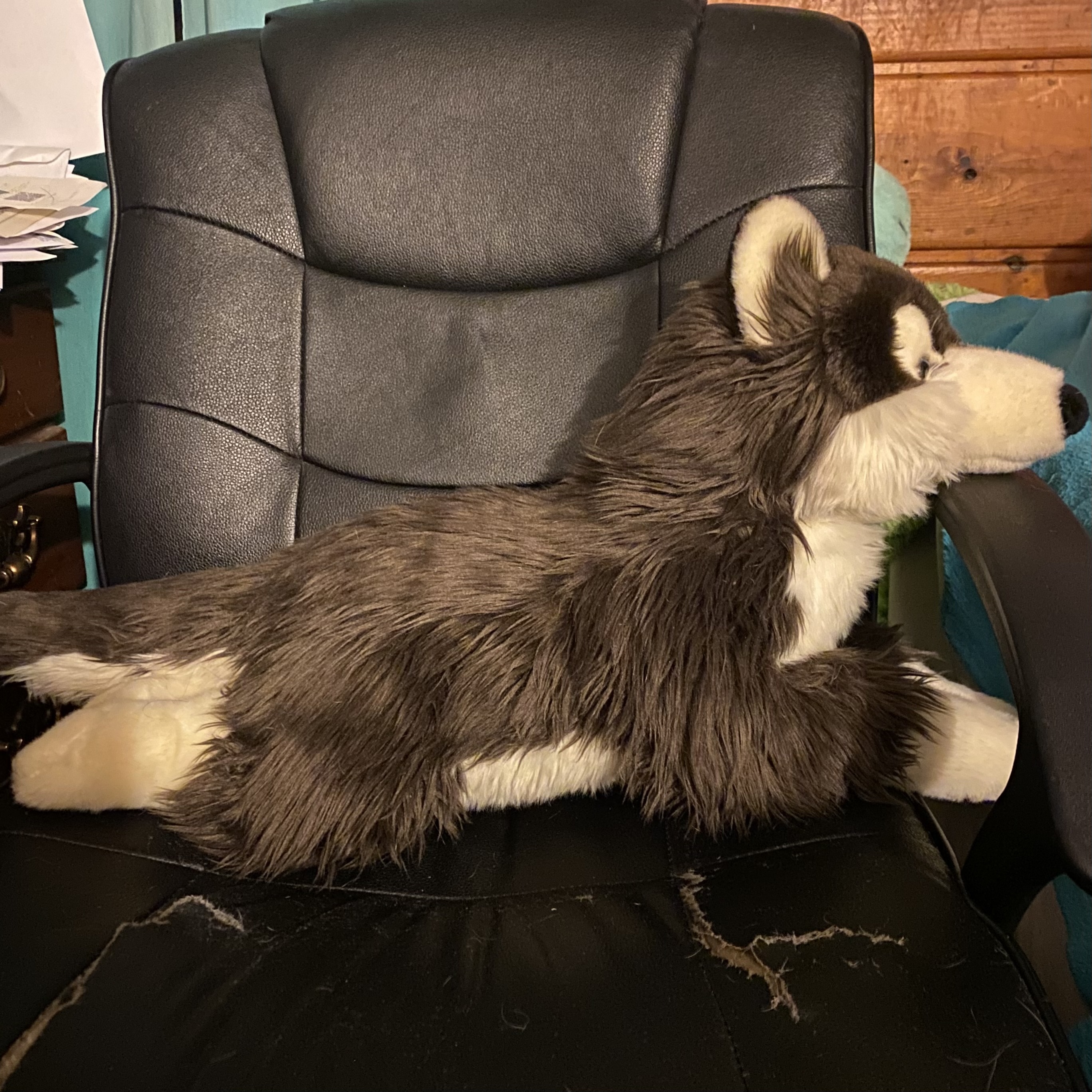 Akari is a big floppy dog plush in a laying position. She has mostly dark brown fur, with a white underside, face, and paws. Her fur is soft and long. She has blue eyes and a black nose. Her ears are pointy and her tail is long.