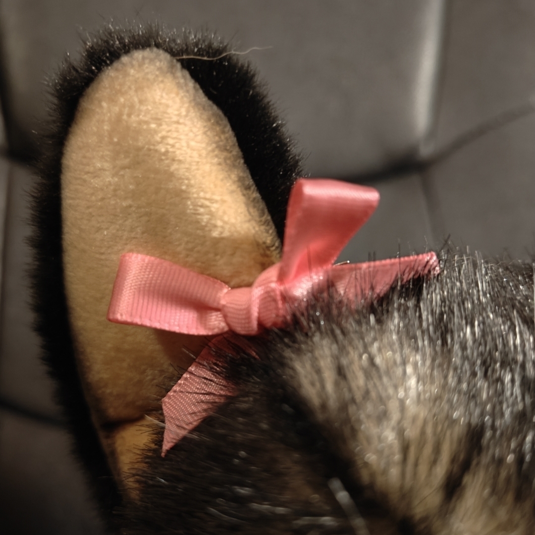 Barbie is a medium sized, floppy dog plush in a sitting position. Her fur is primarily black with bits of light brown poking through. Her face has more light brown showing through than the rest. She also has light brown lower legs and paws. Her ears are pointy and her tail is long. Her eyes are dark brown and her nose is black. She has two small, pink bows clipped onto her ears. She can also be seen wearing a pink beaded bracelet on her front right arm.