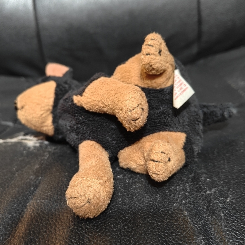 Bean is a small dog plush stuck in a seated position. His fur is primarily black. He has brown fur on his muzzle, cheeks, inner legs/arms, and outter legs/arms from the knee down. He also has small round eyebrows that are brown, along with the insides of his pointy ears. His tail is short. He has brown eyes and a black nose.