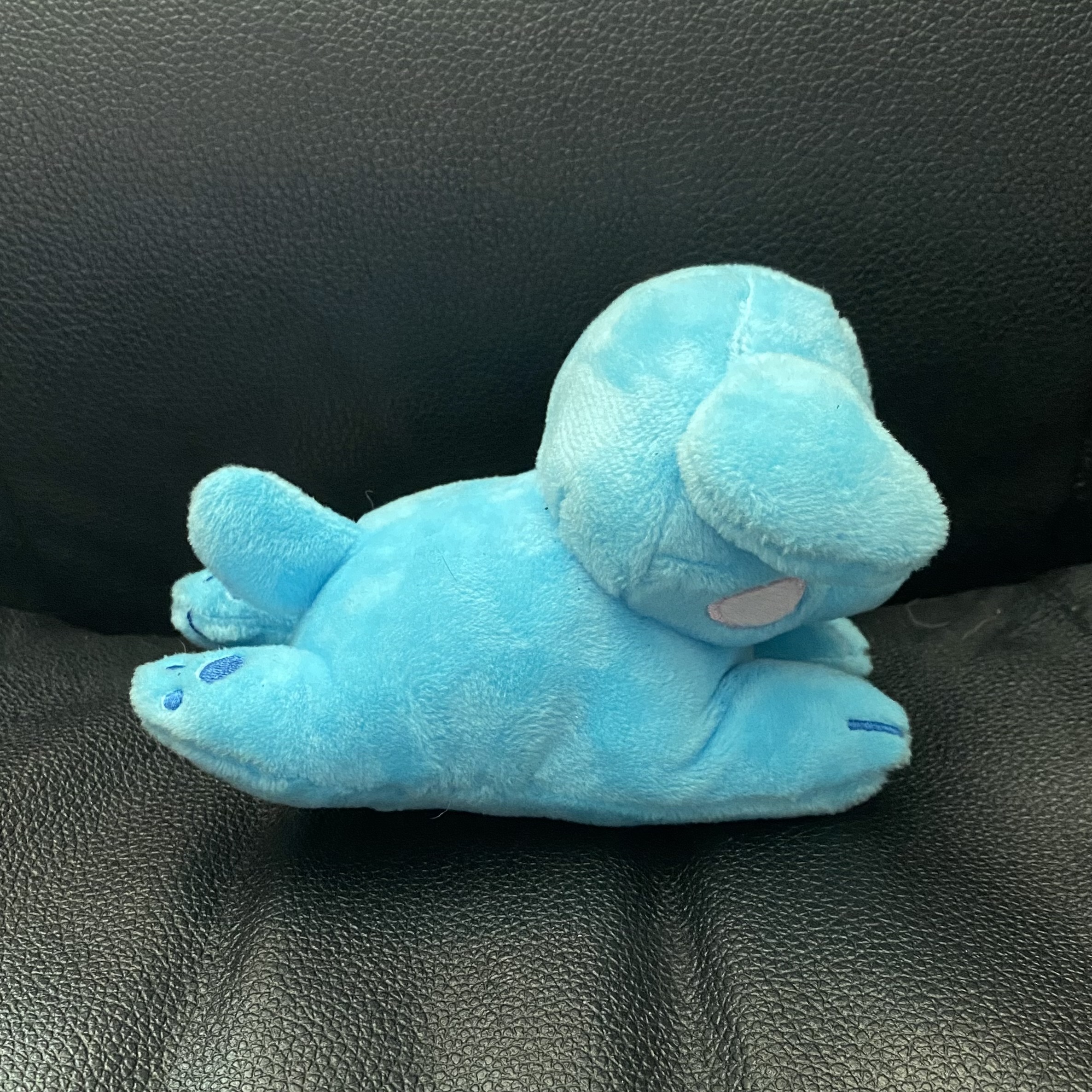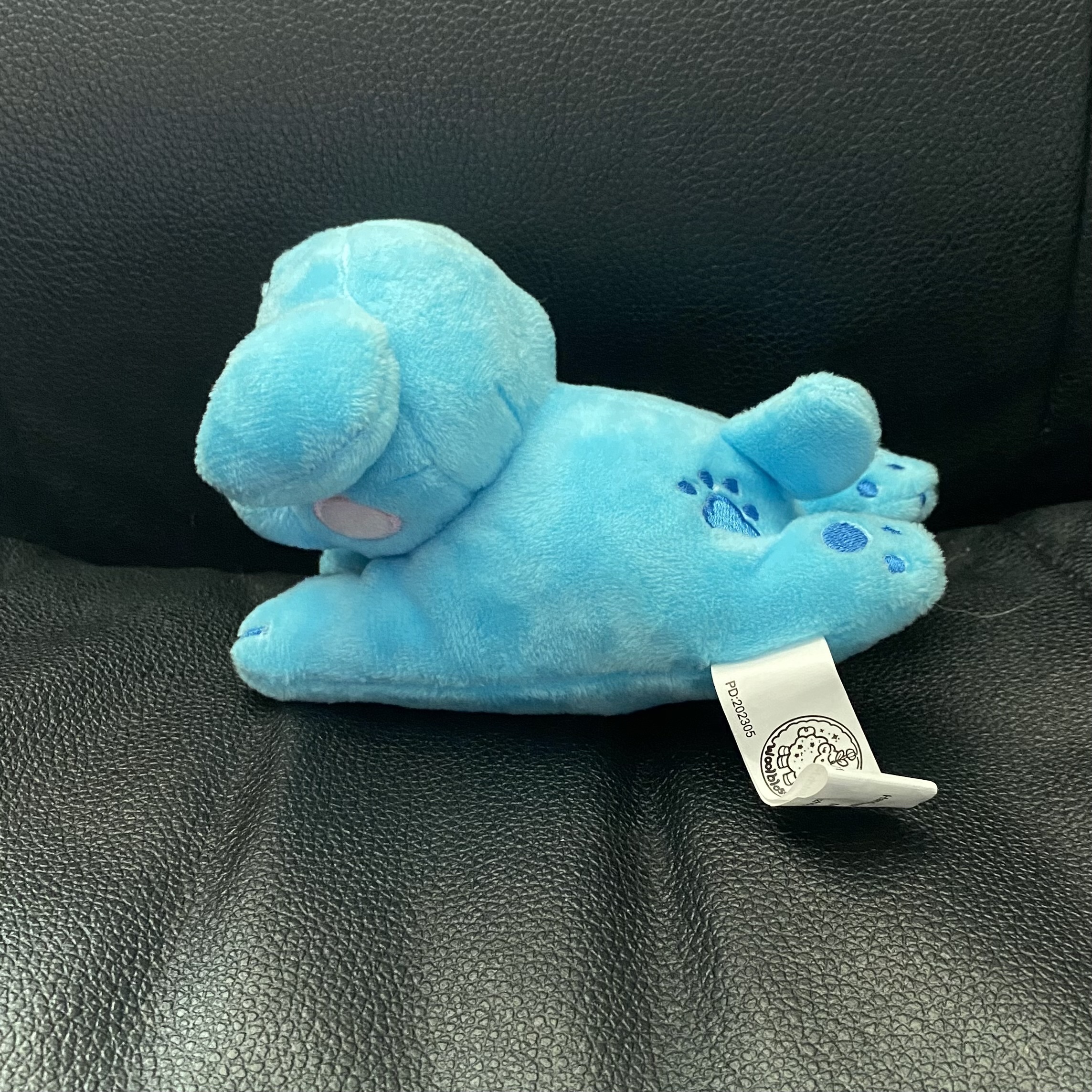Blueberry is a small dog plush in a laying position. Her fur is sky blue with light pink cheeks and a light blue belly. There's a darker blue paw print on her flank. She has darker blue eyes, nose, and paw pads. Her ears are floppy and her tail is short.