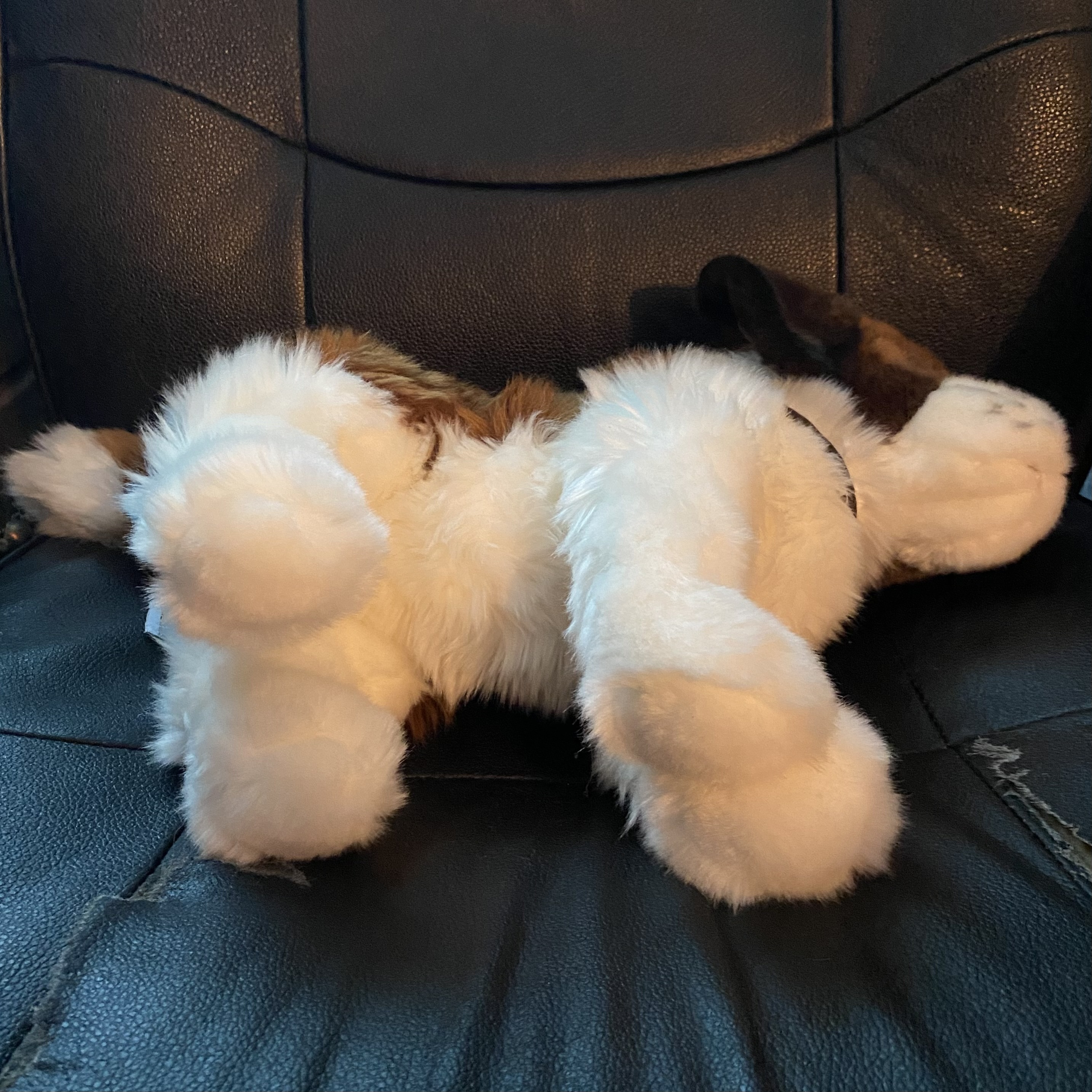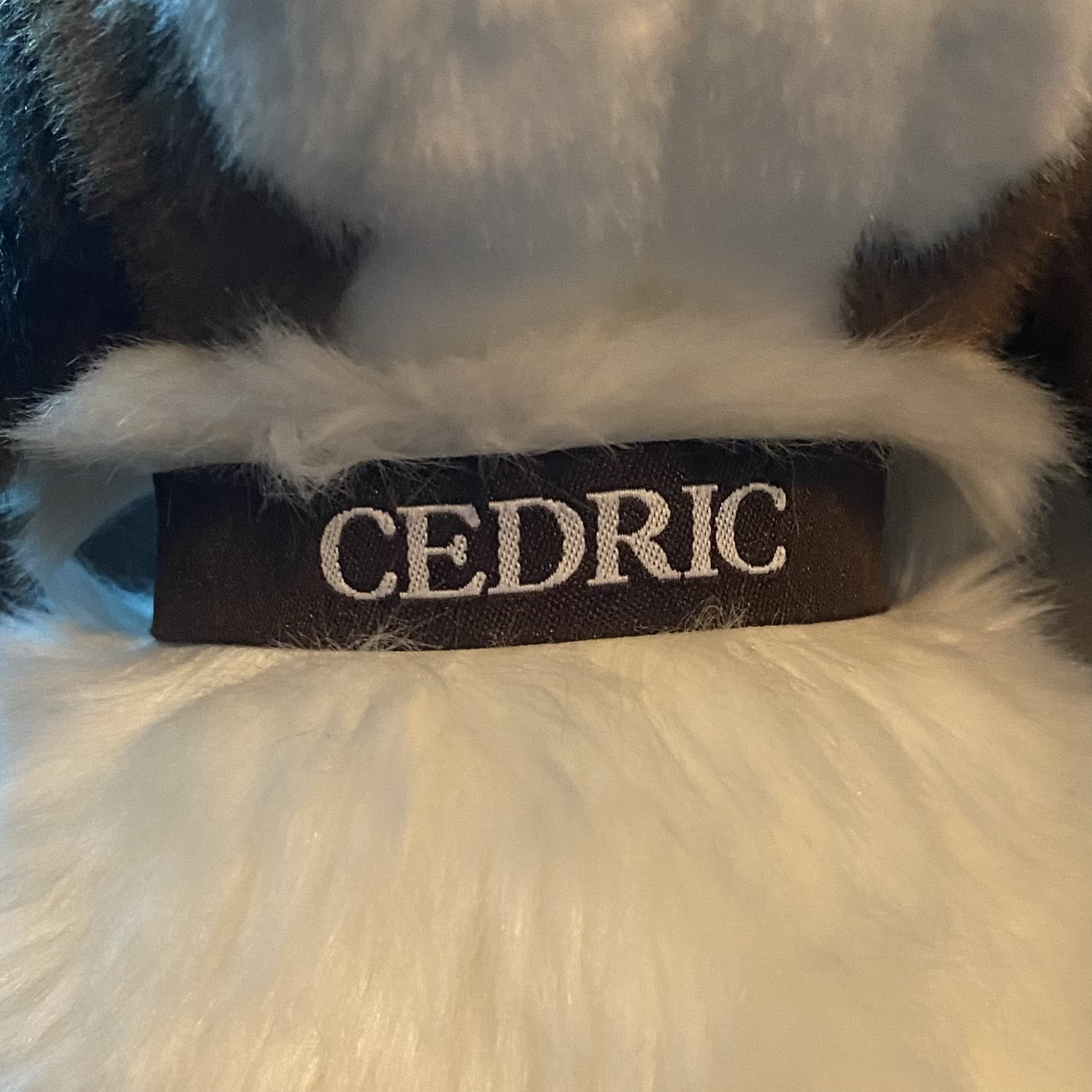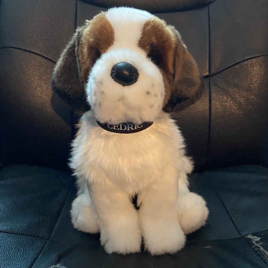 Cedric is a medium sized, floppy dog plush in a standing position. He has long white fur, with brown fur on the sides of his head and on his back. He has 7 black freckles on each side of his white muzzle. His floppy ears are a darker brown than the rest of him. His tail is long and the tip of it is white. He is always wearing a dark brown collar that says “CEDRIC” in white letters. He has brown eyes and a black nose.