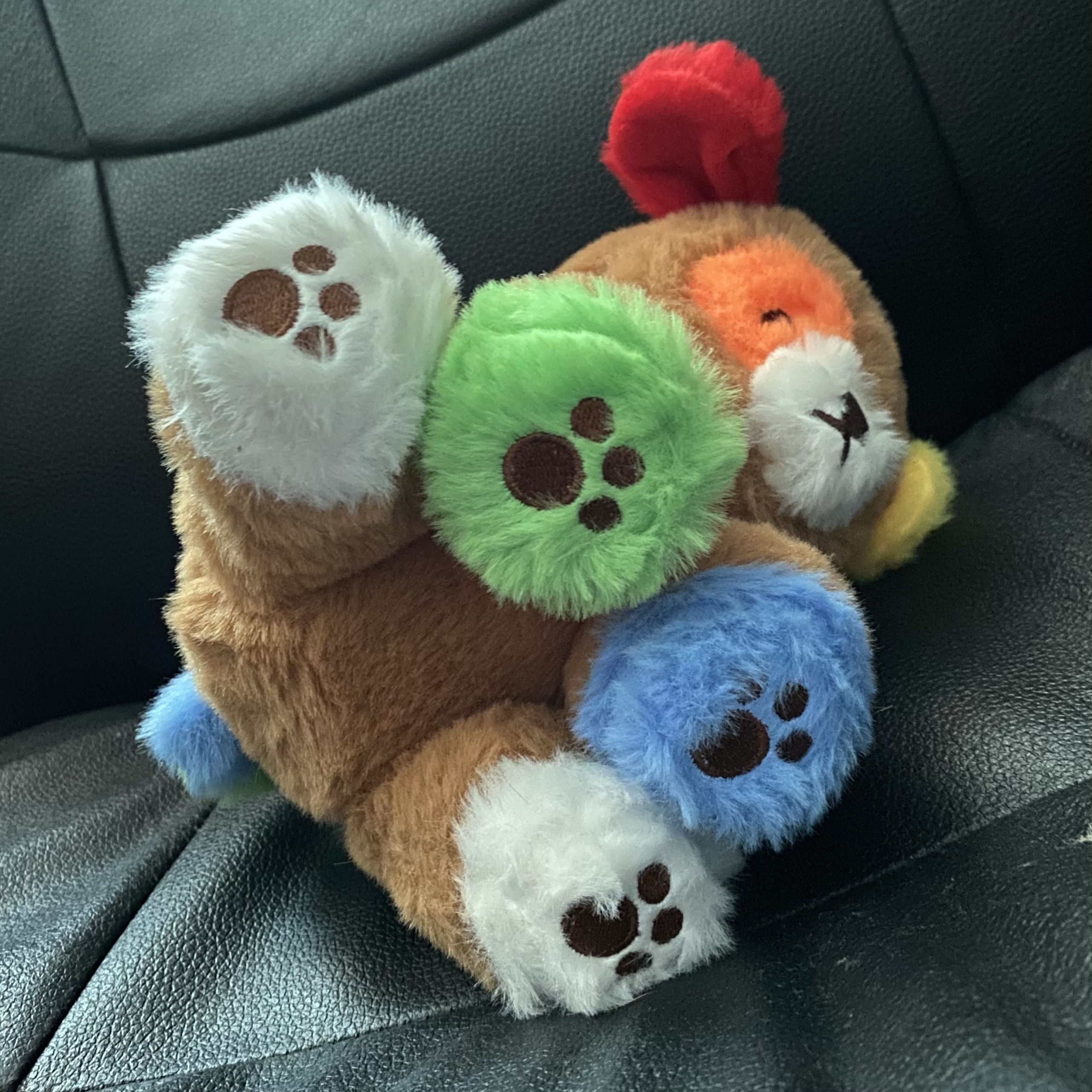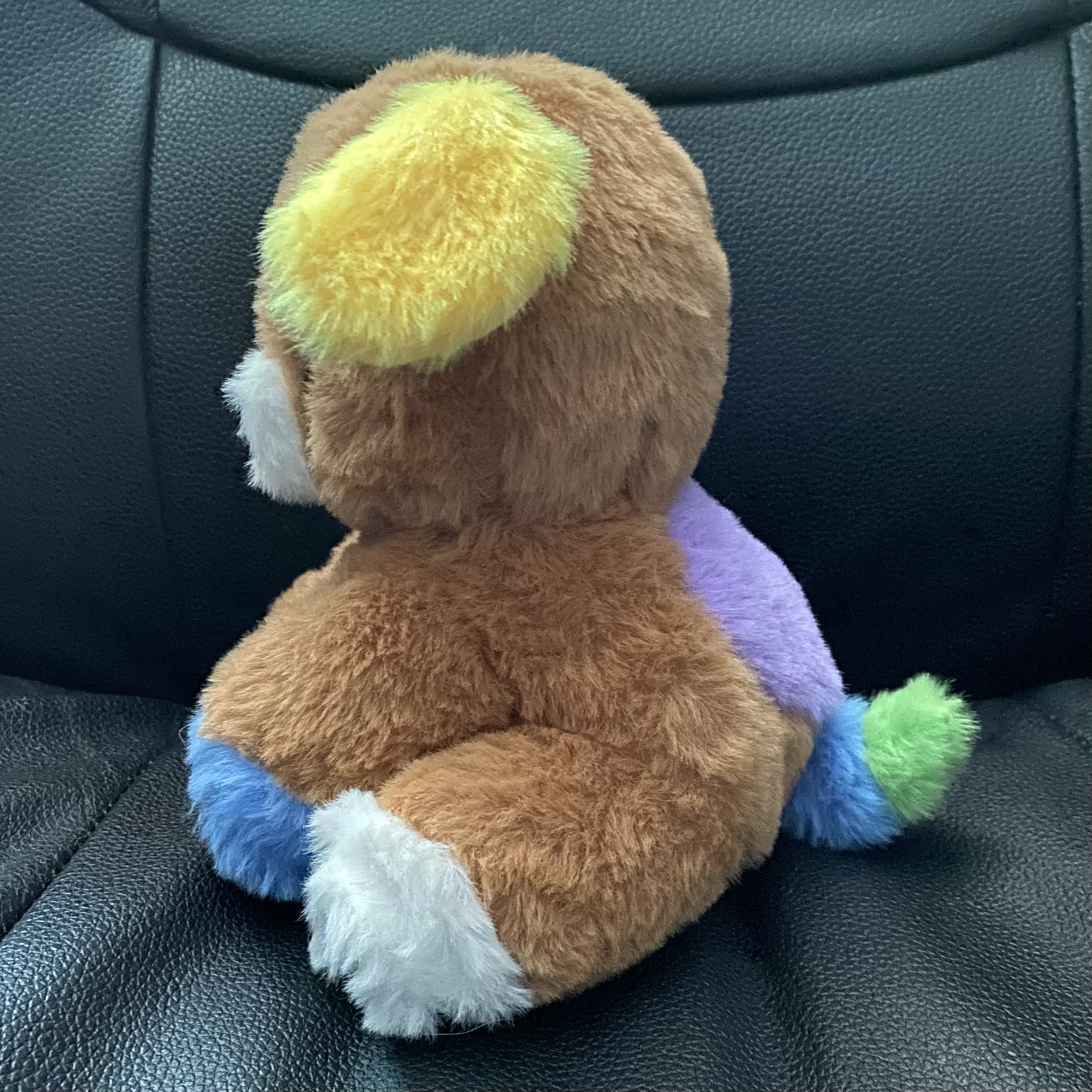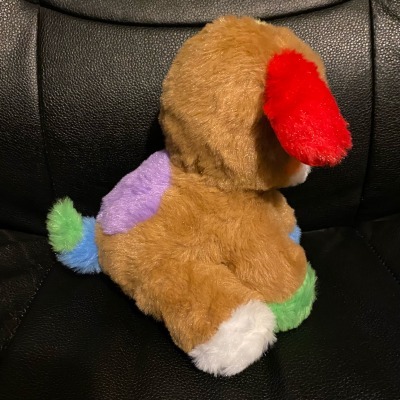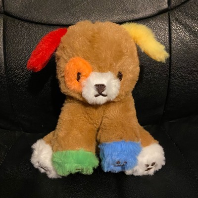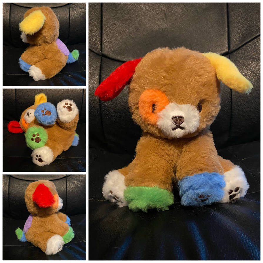 Cookie is a small dog plush in a sitting position. His soft fur is mostly brown, but he has white around his muzzle and hind paws. His left ear is yellow while his right ear is red. There's an orange spot around his right eye. His left front paw is blue, and the right one is green. There is a purple spot on his back. The tip of his tail is green, while the rest of it is blue. His tail is short and slightly curled up. His ears are floppy. He has brown paw pads and a brown nose. His eyes are black.
