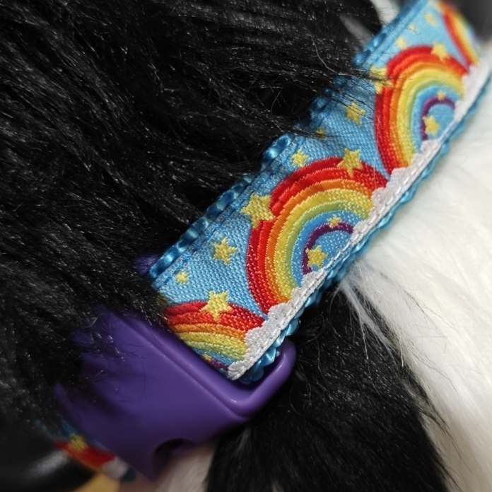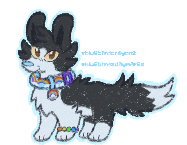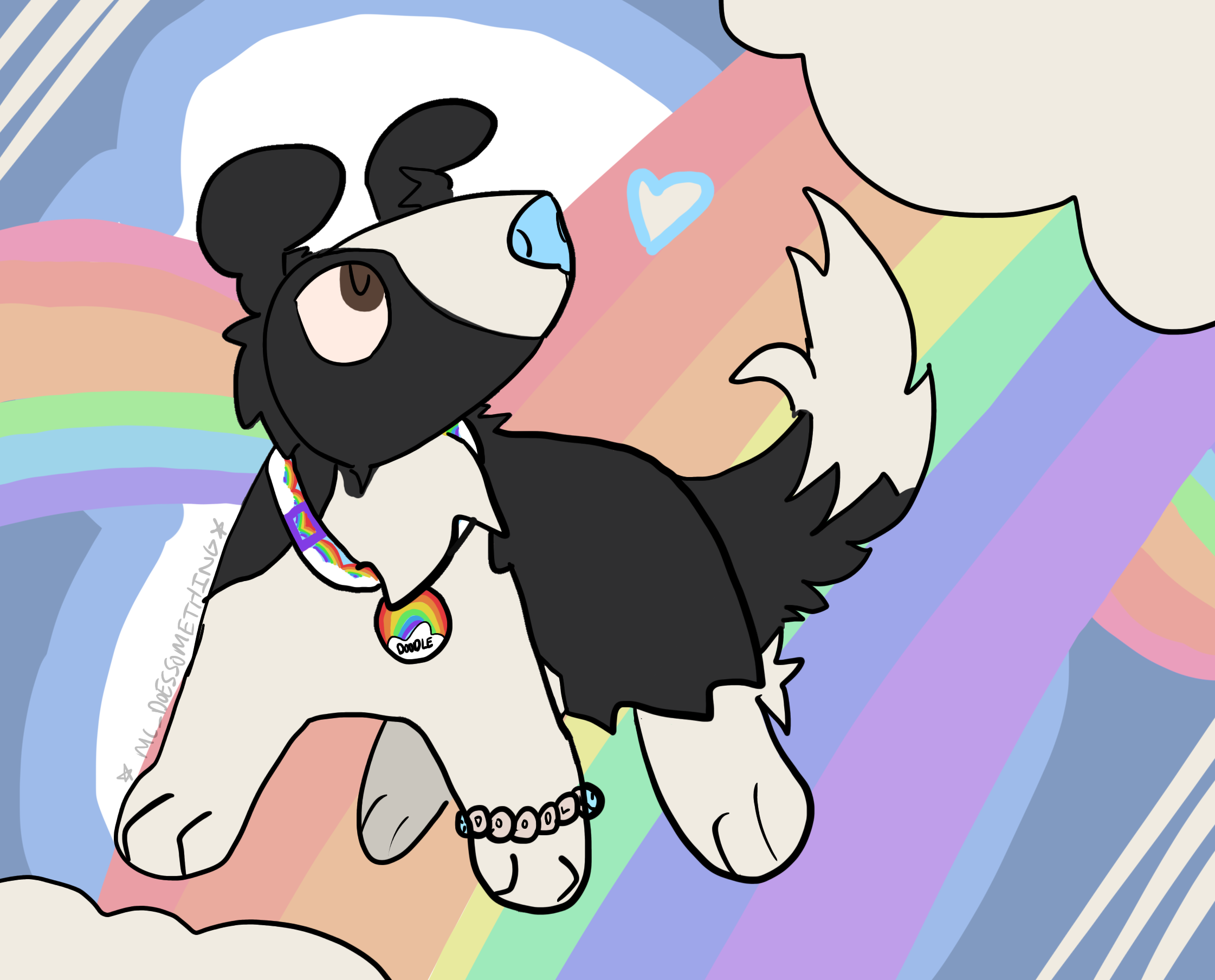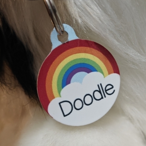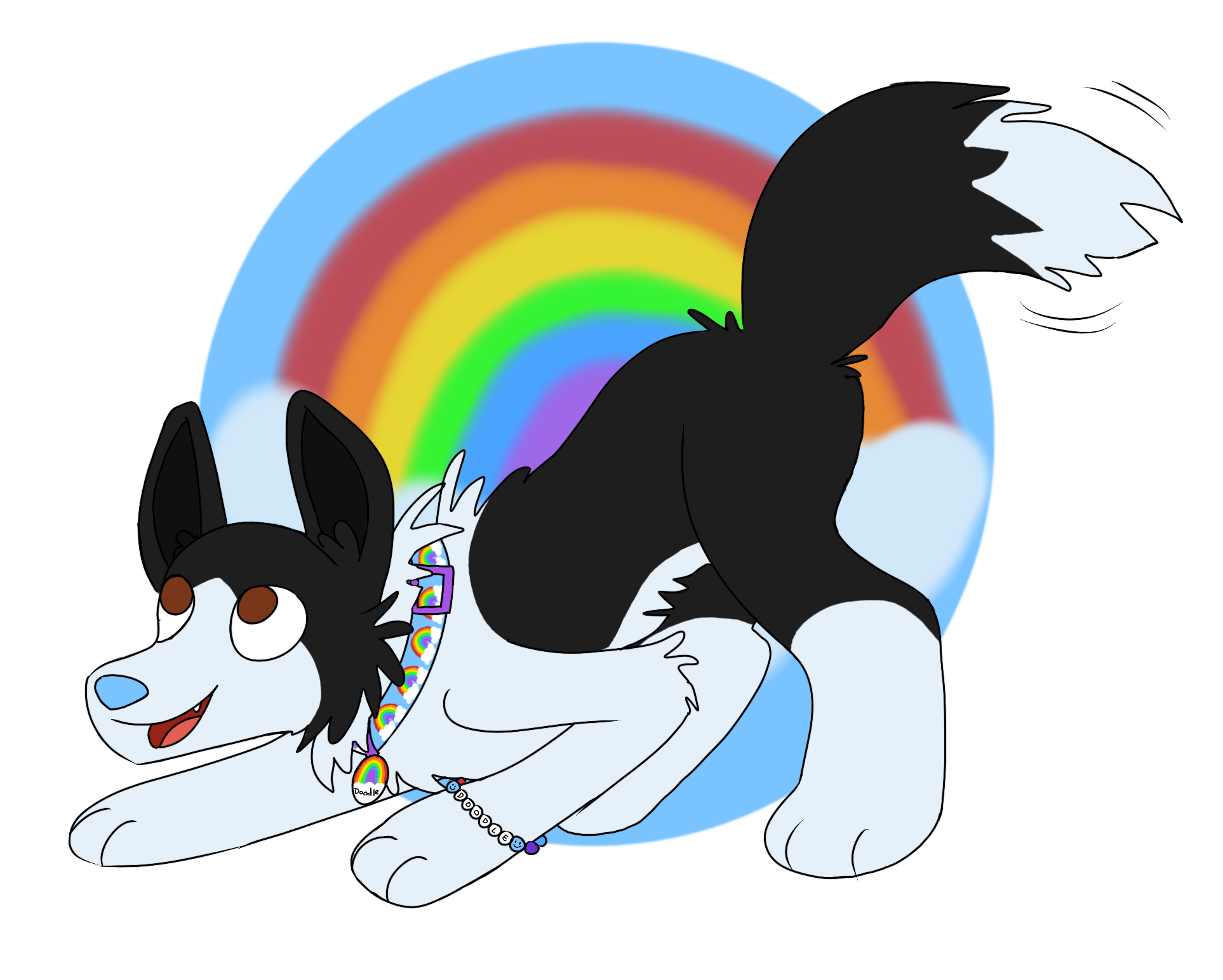 Doodle is a medium sized dog plush in a standing position. His long fur is white, with black covering his head and back end. There is white on his tail tip and hind paws, along with on his muzzle and in between his eyes. His ears are pointy and his tail is long. He has golden brown eyes and a light blue nose. He wears a collar with a repeating rainbow pattern, with a small rainbow name tag dangling from it. He also has a rainbow bracelet with his name on it as well.