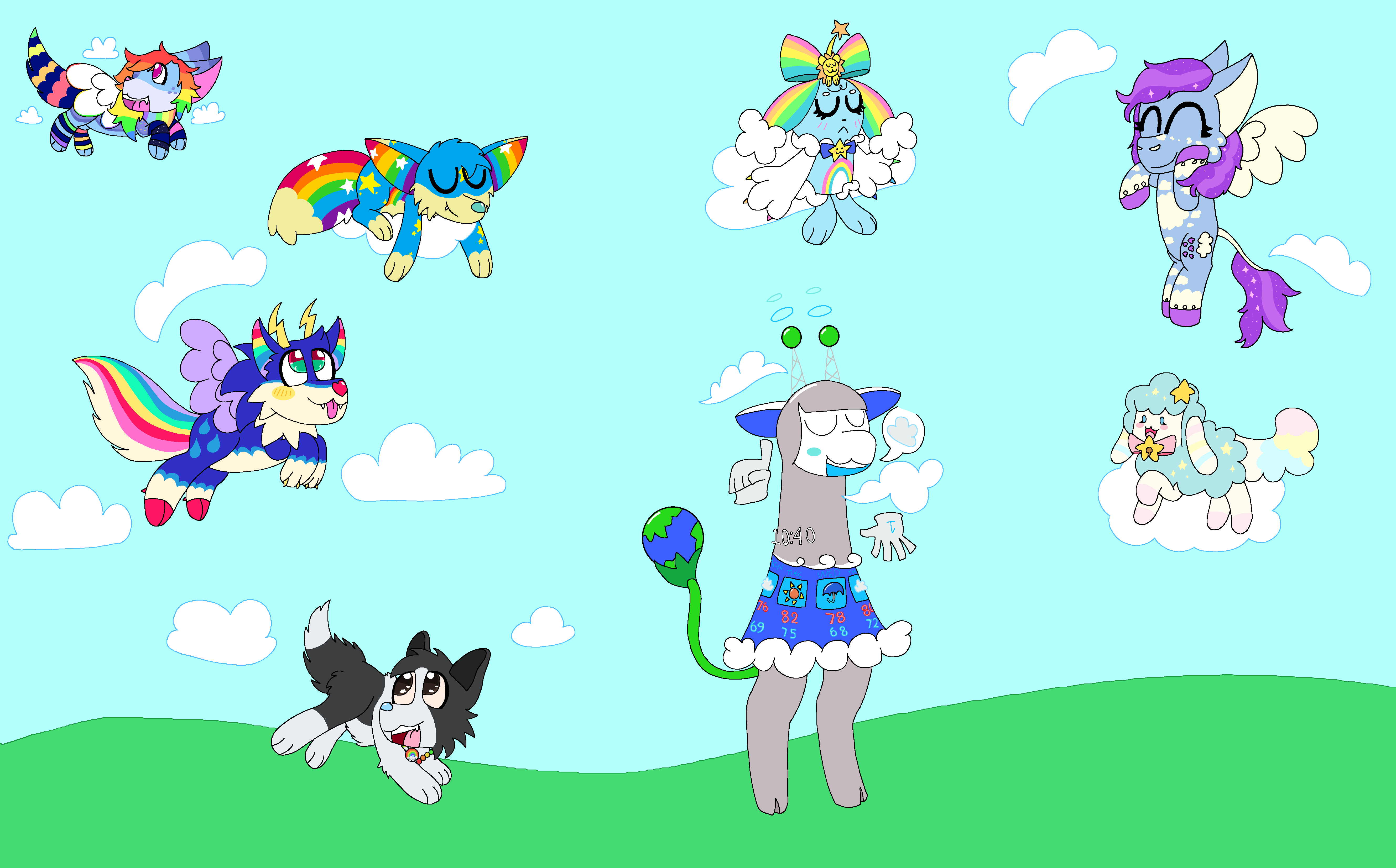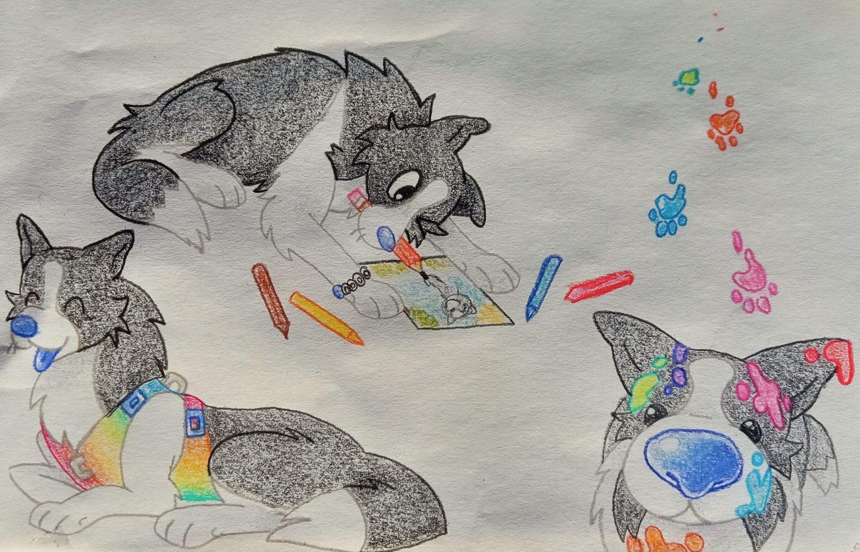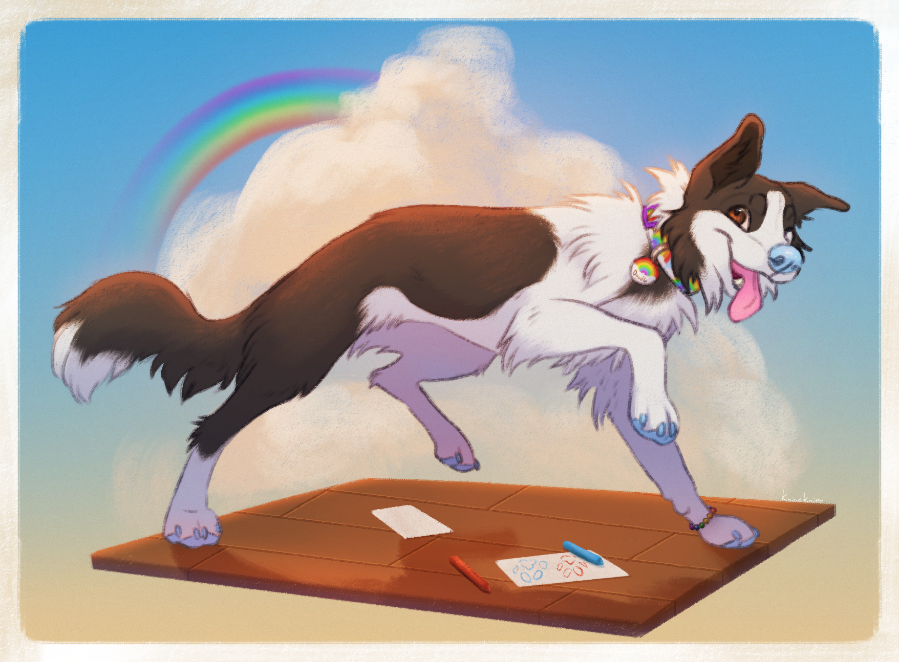 Doodle is a medium sized dog plush in a standing position. His long fur is white, with black covering his head and back end. There is white on his tail tip and hind paws, along with on his muzzle and in between his eyes. His ears are pointy and his tail is long. He has golden brown eyes and a light blue nose. He wears a collar with a repeating rainbow pattern, with a small rainbow name tag dangling from it. He also has a rainbow bracelet with his name on it as well.