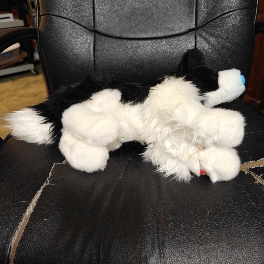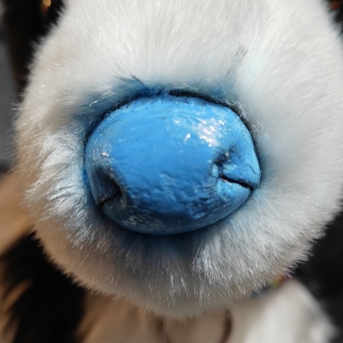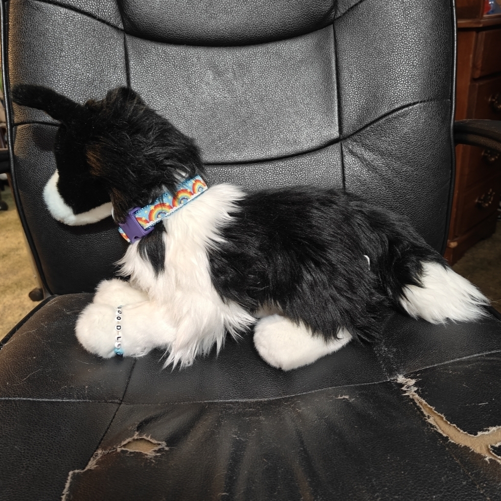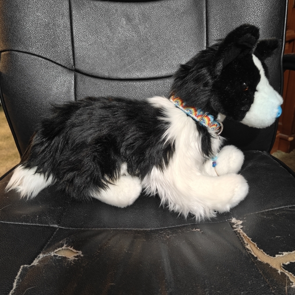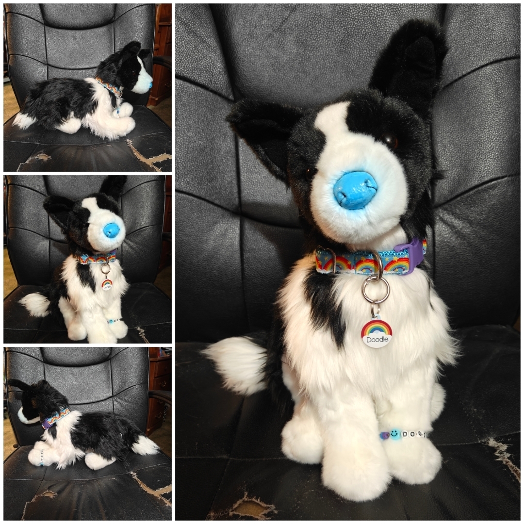Doodle is the Chase the Border Collie dog plush. He has been modified to have a light blue nose and pointy ears.