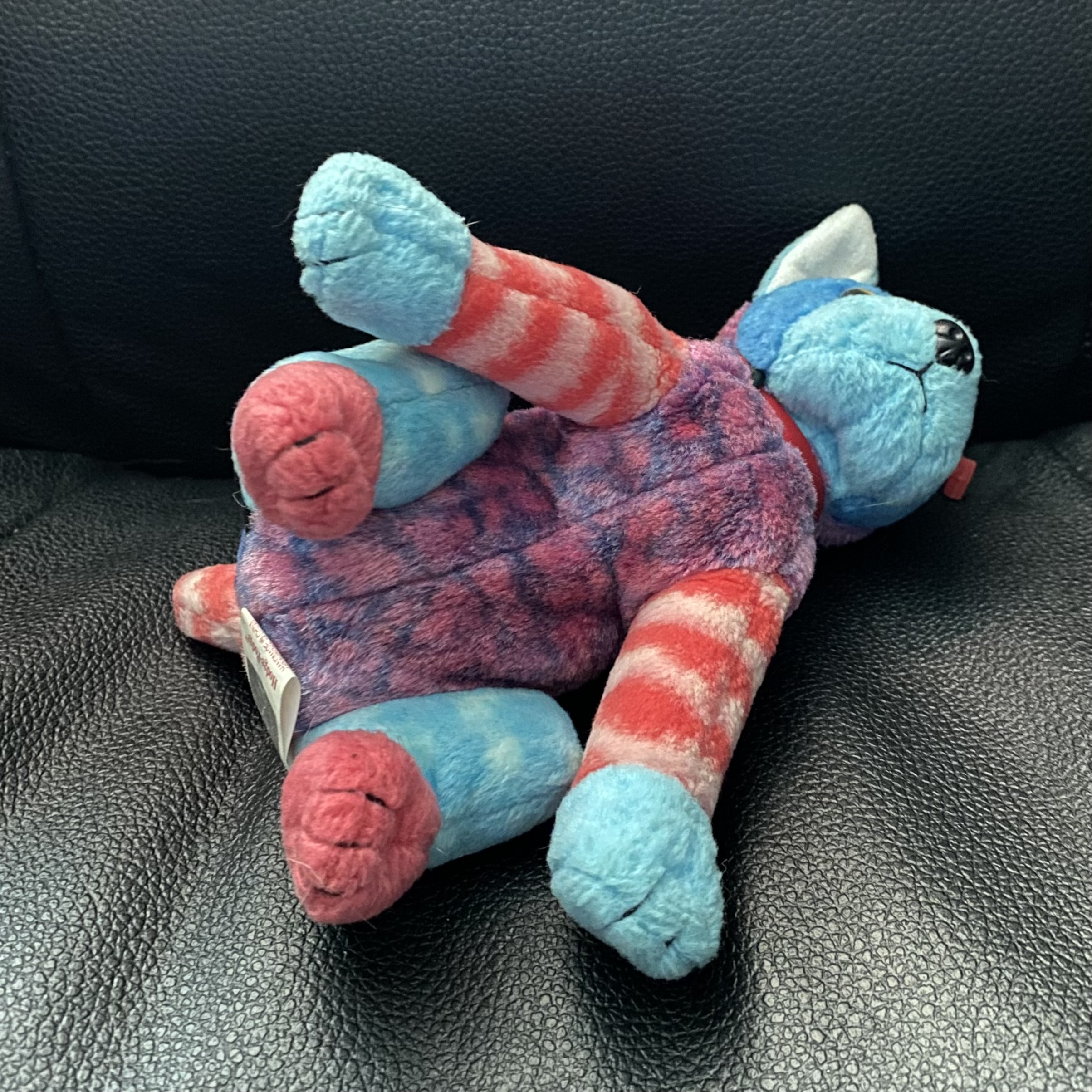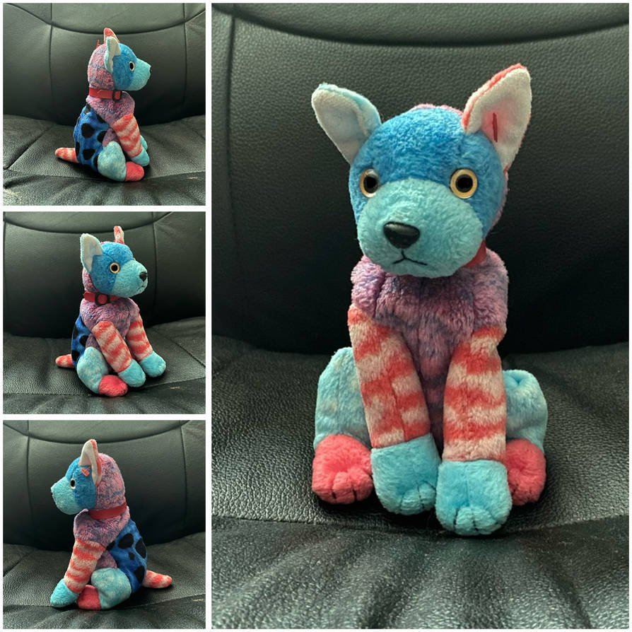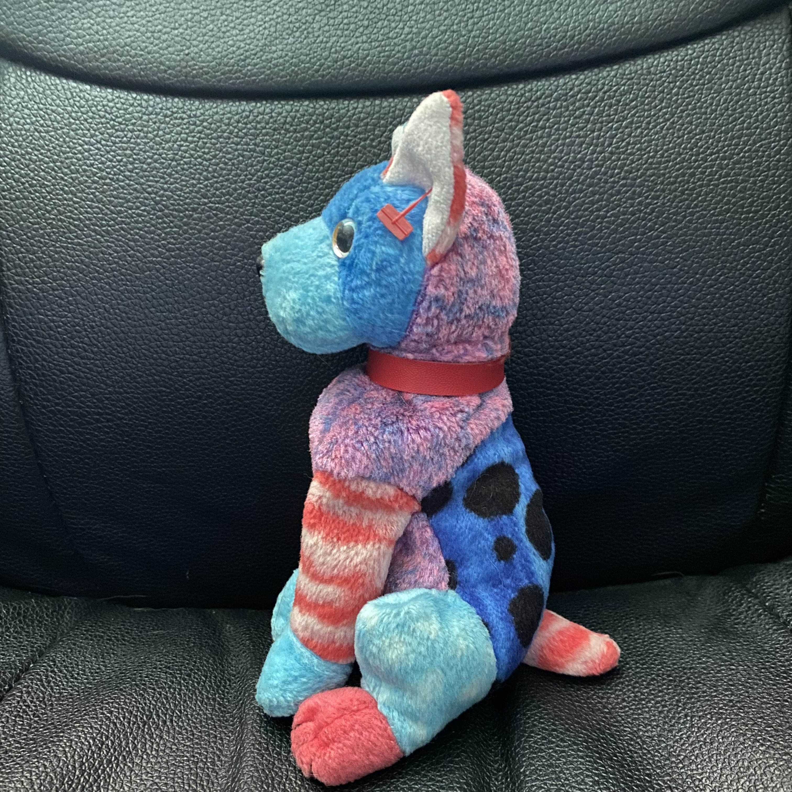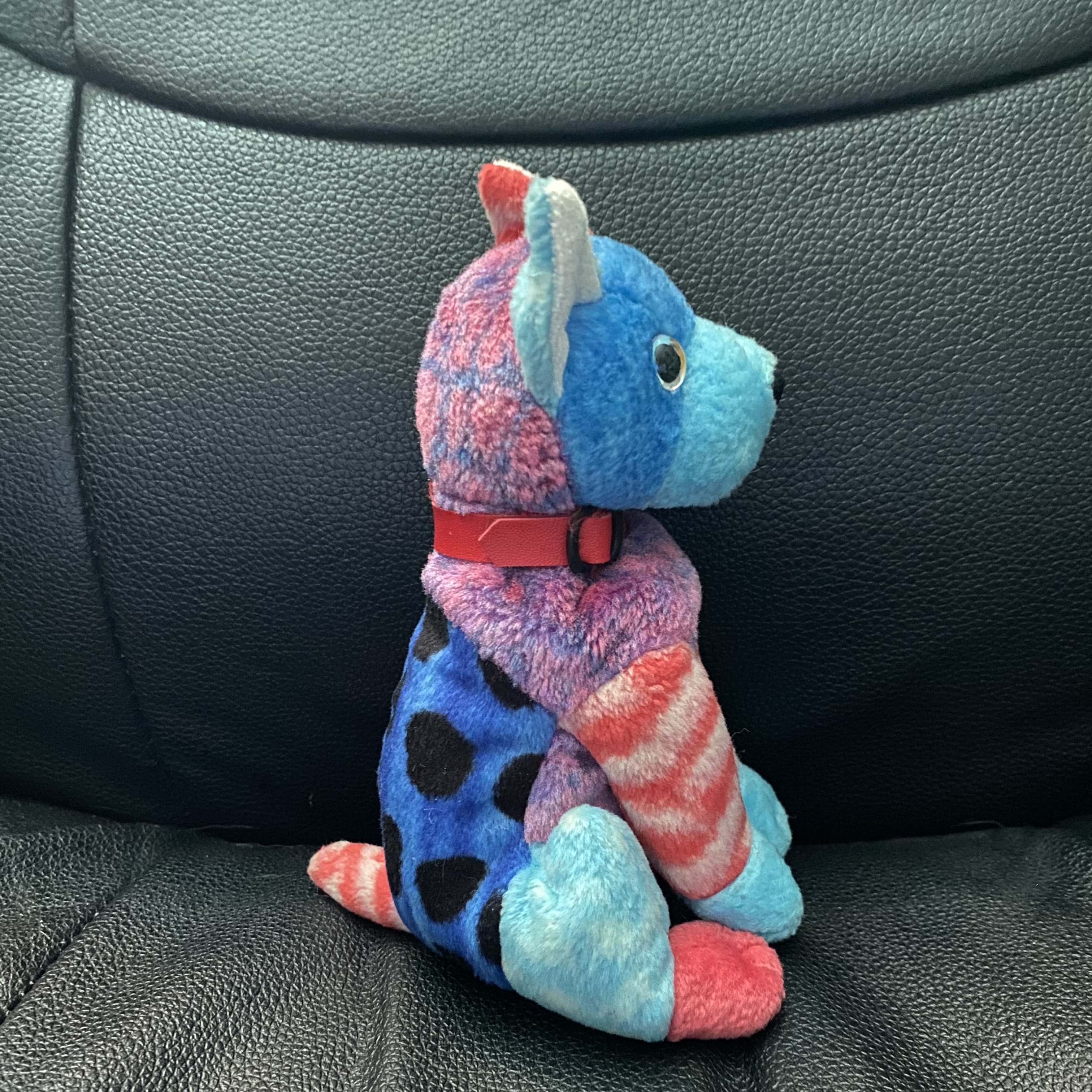 Hodgepodge is a small dog plush in a sitting position. He has a blue face with a light blue muzzle. One ear is light blue, and the other is red. His neck, chest and back of his head are all purple. His front legs are red and pink striped with light blue paws, while his back legs are light blue with red paws. His back is dark blue with black spots. He has a red collar. His sgort tail is red and pink striped and his ears are pointy. He has yellow eyes and a black nose.