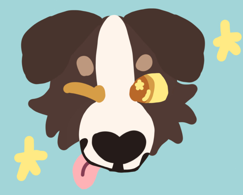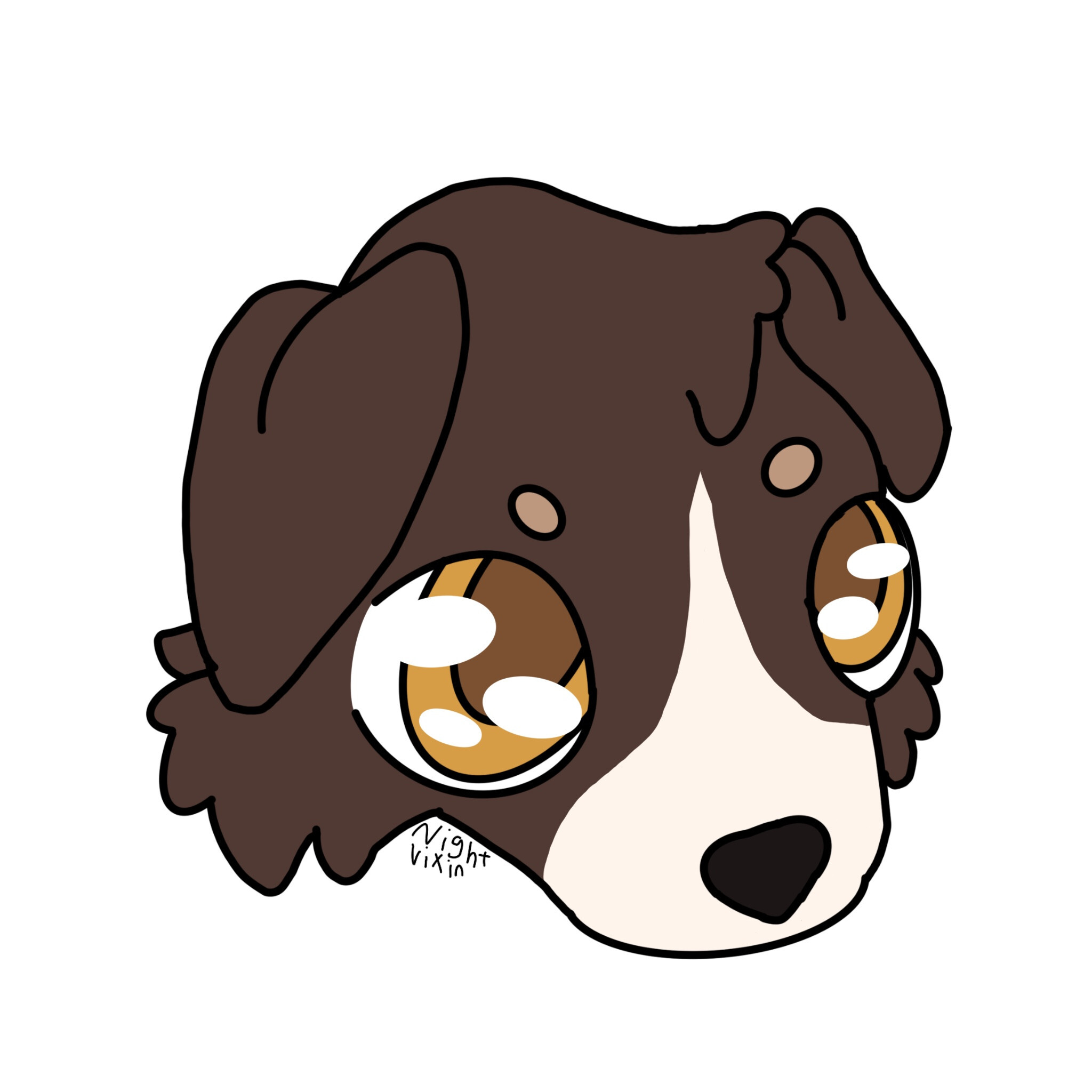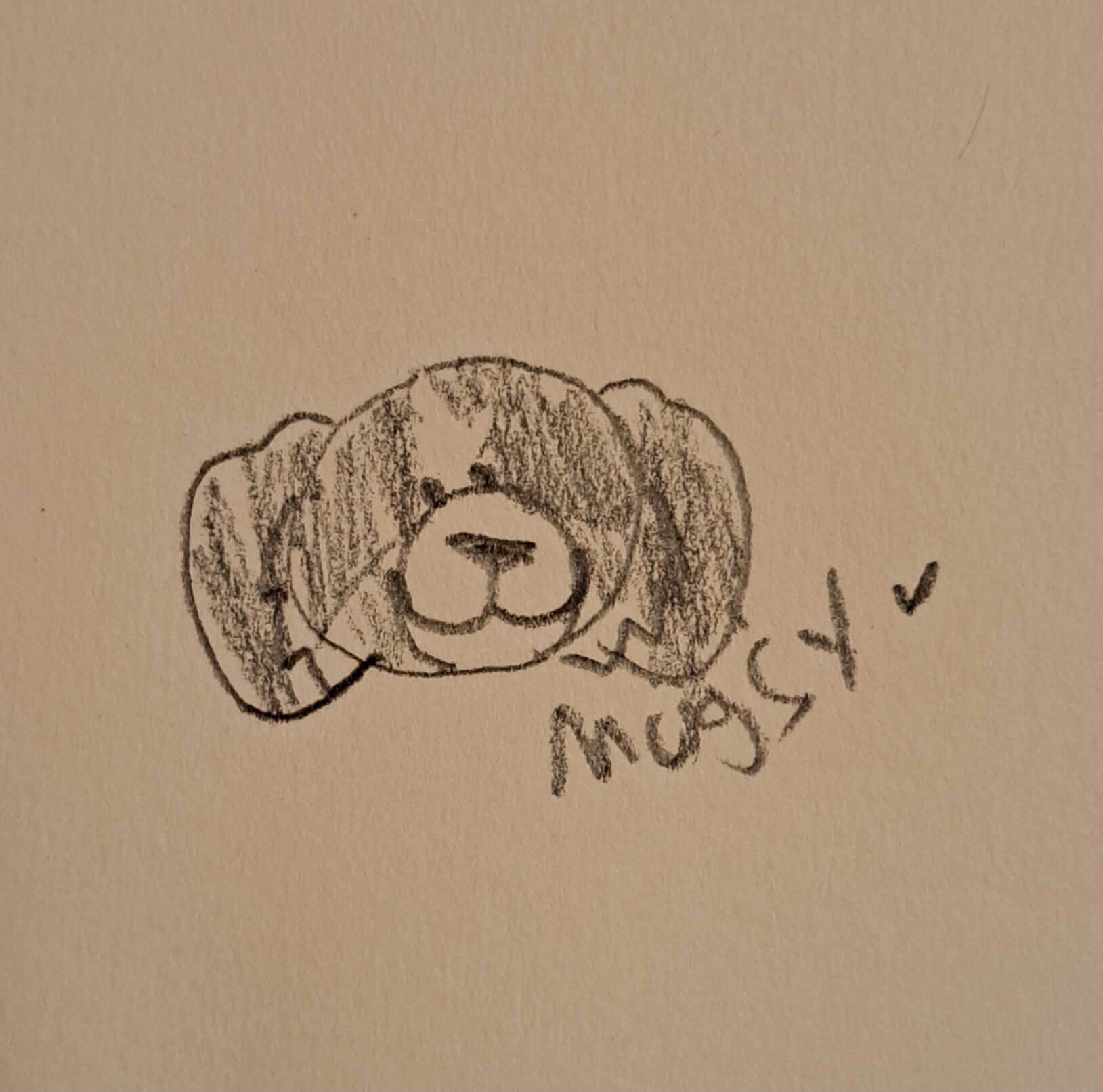 Mugsy is a medium sized dog plush in a sitting position. His fur is dark brown with a white chest, face, and paws, and light brown legs. He has floppy ears and a short tail. His eyes are brown and his nose is black.