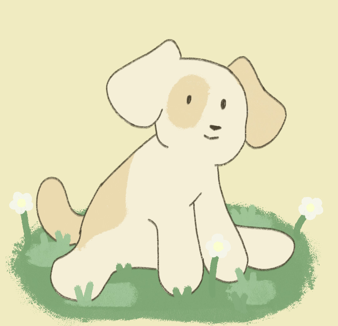 Peaches is a floppy, medium-sized dog plush in a standing position. Her fur is primarily a cream color, with darker spots over her right eye, left ear, and butt/tail. Her ears are floppy and her tail curls up a little bit. She has small brown eyes and a small brown nose.